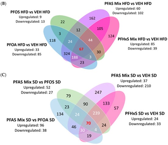 Individual and shared differentially expressed proteins (DEPs) among treatment comparisons. The Venn diagrams were created by Log2 transforming the treatment comparison fold changes of PND21 pups, and then further filtering out all insignificant Log2FC values (p < 0.05). Each Venn diagram aims to elucidate both exclusive and commonly expressed significant proteins between comparisons. (A) PFAS treatment* SD versus VEH SD, (B) PFAS treatment* HFD vs. VEH HFD, and (C) PFAS Mix SD vs. PFAS treatment* SD. * PFAS treatment included: PFOA, PFOS, PFHxS.