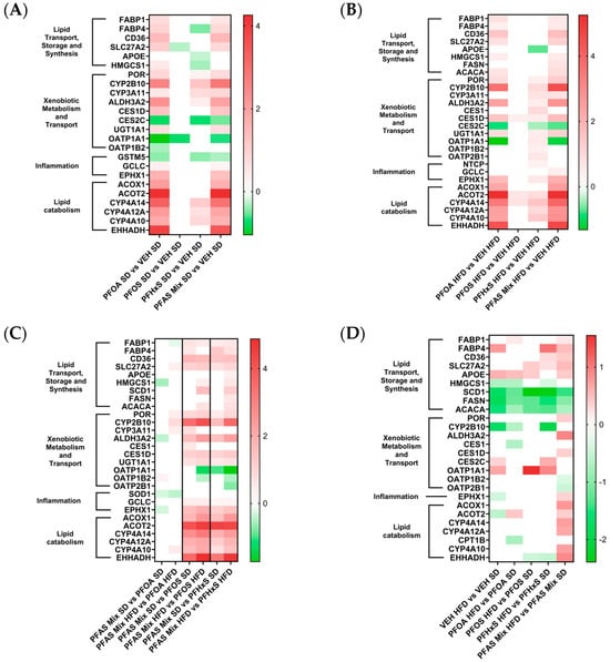 Evaluation of PFOA, PFOS, PFHxS; and a PFAS Mixture-induced modulation of lipid metabolism and transport, xenobiotic metabolism and transport, and lipid catabolism pathways in the neonatal liver. Heatmaps (A–D) represent a Log2 transformation of comparison fold changes, by filtering out of all insignificant Log2FC values (p < 0.05).