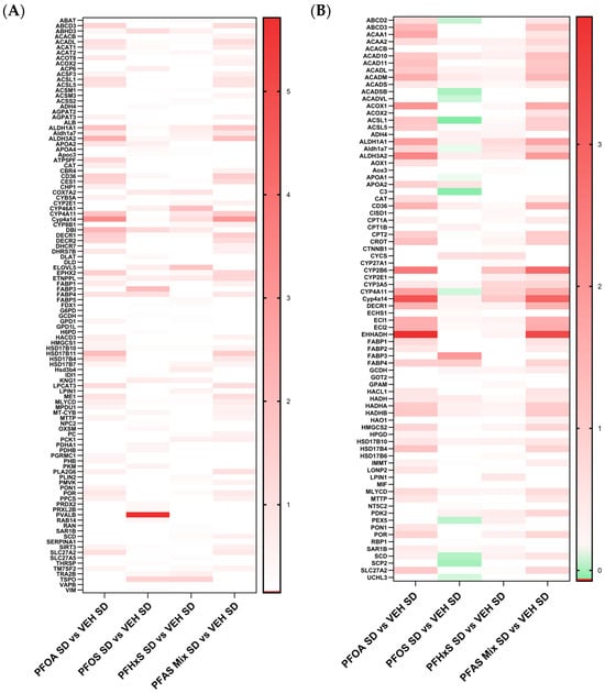 Expression of proteins in lipid synthesis and oxidation of pathways. Differential expression of proteins contributing to the (A) synthesis of lipids and (B) oxidation of lipids were identified through IPA disease and biological function analyses. The heat maps were created by Log2 transforming the standard diet treatment comparison fold changes of PND21 pup livers. The treatment comparisons consist of: PFOA SD and VEH SD, PFOS SD vs. VEH SD, PFHxS SD vs. VEH SD, and PFAS Mix SD vs. VEH SD.