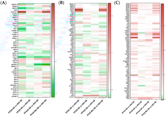 Proteins modulated in pathways related to liver damage. Proteins involved in (A) liver damage, (B) inflammation of liver, and (C) hepatic steatosis disease and biological function pathways were identified through IPA analyses. The heat maps were created by Log2 transforming the standard diet treatment comparison fold changes of PND21 pup livers. The treatment comparisons consist of PFOA SD vs. VEH SD, PFOS SD vs. VEH SD, PFHxS SD vs. VEH SD, and PFAS Mix SD vs. VEH SD.