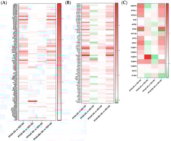 Proteins modulated in pathways related to fatty acid metabolism and transport. Proteins involved in (A) fatty acid metabolism, (B) oxidation of fatty acids, and (C) transport of long chain fatty acids were identified by IPA’s disease and biological function pathway analysis. Heat maps represent Log2 transformation of comparisons of PFAS treatment versus VEH control. The comparisons between treatments were as follows: PFOA SD vs. VEH SD, PFOS SD vs. VEH SD, PFHxS SD vs. VEH SD, and PFAS Mix SD vs. VEH SD.