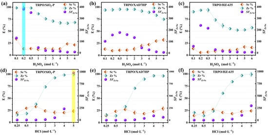 Effect of different carriers and acidity on the adsorption performance (a,d) TRPO/SiO2-P, (b,e) TRPO/XAD7HP, (c,f) TRPO/HZ-635 (m/V = 0.1 g/5 mL, Sc and Zr each 5 mM (mixture), T = 298 K, shaking speed: 140 rpm, t = 24 h).