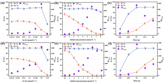 Figure 3b,e shows the performance of separation influenced by the initial concentration, with the Sc/Zr molar ratio maintained at 1:1. The outcomes aligned with those observed in the molar ratio experiments. Figure 3c,f reports the impact of the solid–liquid ratio on adsorption performance, and it was observed that for 100% removal of zirconium ions, the mass of the adsorbent reached 0.1 g. Subsequent increases in adsorbent mass paradoxically diminished the separation performance, as the quantity of zirconium ions was insufficient to occupy the gradually increasing adsorption sites that were used for scandium ions. In summary, the adsorption of scandium and zirconium ions by the adsorbent exhibited a clear order for preference of Zr(IV) over Sc(III).