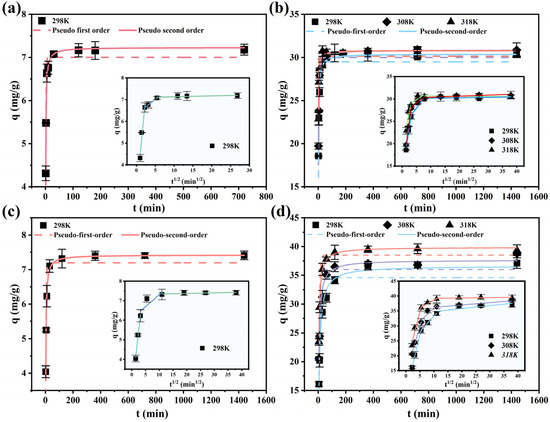 Adsorption kinetics of TRPO/SiO2-P resin towards (a) Sc and (b) Zr in 0.2 M H2SO4 solution and (c) Sc and (d) Zr in 5 M HCl solution (m/V = 0.1 g/5 mL, Sc or Zr concentration = 8 mM, T = 298 K, shaking speed: 140 rpm).