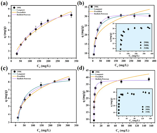 A comparison of the data in Table 4 and Table 5 indicates that both Langmuir and Redlich–Peterson models provide a superior fit. Notably, the g-value in the Redlich–Peterson model parameters is very close to 1. Consequently, it is reasonable to infer that the adsorption process adheres to the Langmuir model, characterized by homogeneous monolayer adsorption. According to the Langmuir model fitting results in the table, the maximum adsorption capacities (qm) of the adsorbent for Sc(III) and Zr(IV) in sulfuric and hydrochloric acids at 298 K were determined to be 10.71 mg·g−1, 8.77 mg·g−1, 32.83 mg·g−1, and 38.03 mg·g−1, respectively.