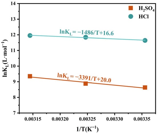 A linear relationship between and has been plotted (Figure 6); the determination of parameters and values from the slopes and intercepts, respectively. The relevant parameters are summarized in Table 6. As indicated by the results in Table 6, positive values suggest that the adsorption of Zr(IV) by the adsorbent in sulfuric and hydrochloric acid media is an endothermic process. The positive values imply a decrease in surface ordering during the adsorption of zirconium ions by the adsorbent. A negative value denotes the spontaneous nature of zirconium ion adsorption by the adsorbent [45]. According to Table 4 and Table 5, the adsorption capacity of the adsorbent for zirconium exhibited a slight increase (approximately 1~2 mg·g−1) with rising temperatures. Given that zirconium adsorption is a heat-absorbing process, it can be inferred that elevated temperatures marginally enhance the adsorption of zirconium ions, although the effect is relatively modest.