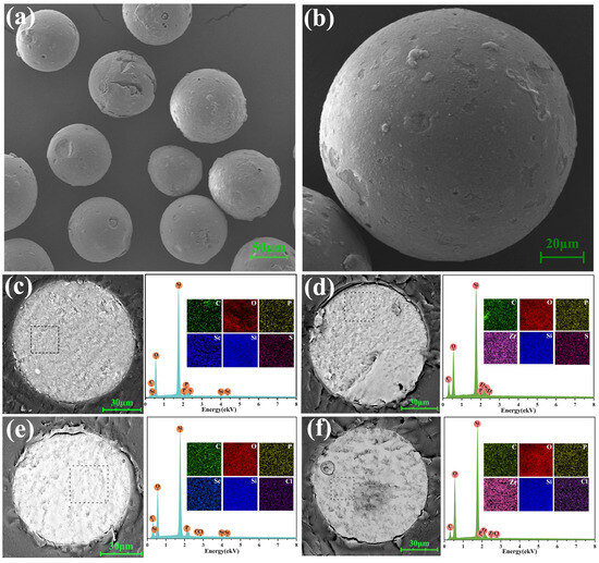 The micrograph of TRPO/SiO2-P was shown in Figure 7a,b, which showed that the TRPO/SiO2-P resin is a spherical structure composed of particles, each with a relatively uniform diameter of about 100 µm. EDS results investigated the elemental composition of the resin after adsorption. The results showed that carbon (C), nitrogen (N), sulfur (S), chlorine (Cl), oxygen (O), scandium (Sc), and zirconium (Zr) were uniformly distributed in the cross-section of the adsorption-treated TRPO/SiO2-P (Figure 7c–f). This indicates the successful adsorption of scandium and zirconium by the resin, and the presence of sulfur and chlorine elements in the cross-section suggests that acidic radical ions (SO42− and Cl−) are also involved in the adsorption process.