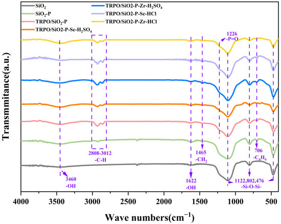In Figure 8, all samples exhibited weak adsorption bands at 1622 and 3460 cm−1, which is attributable to the bending vibrations of hydroxyl groups in the adsorbed water on the samples [46]. Bands at 2808–3012 cm−1 correspond to the stretching vibrational peak of –C–H aliphatic [47]. Notably, the peaks of C–H for TRPO/SiO2-P are more pronounced than that for SiO2-P, suggesting that the presence of TRPO increases the –C–H content. An absorption band for the benzene ring is evident at 706 cm−1, and the band at 1465 cm−1 results from the stretching vibration of –CH2 [47,48]. The absorption bands appearing at 476, 802 cm−1 are asymmetric stretching vibrations of the –Si–O–Si– bonds, while the absorption band at 1122 cm−1 is attributed to the symmetric stretching vibration of the same group [49]. At 1226 cm−1, the bending vibrational peak of the –P=O bond is present; however, changes in the –P=O bond’s appearance before and after adsorption are obscured by the influence of the –Si–O–Si– peak [36].