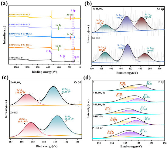 (a) XPS full spectra of TRPO/SiO2-P, (b) high-resolution Sc 2p spectra, (c) high-resolution Zr 3d spectra, and (d) high-resolution P 2p spectra.