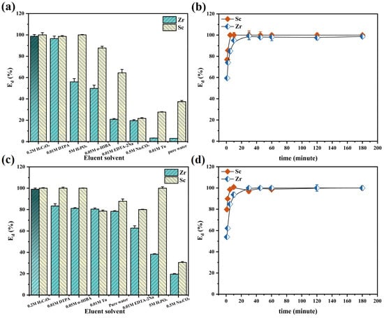 The desorption properties of scandium and zirconium were assessed using eight different eluents to investigate the desorption kinetics. The results are presented in Figure 10. Notably, only 0.2 M H2C2O4 achieved a desorption efficiency exceeding 99% for Zr, making it a particularly suitable eluent given its cost-effectiveness. Figure 10b,d displays the desorption kinetics of scandium and zirconium using 0.2 M H2C2O4, which shows a rapid elution of both Sc and Zr, with nearly 100% elution accomplished within 30 min. This indicates that the eluent efficiently and swiftly removes scandium and zirconium ions adsorbed on the adsorbent’s surface.