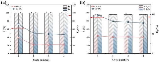 To assess the reusability of the adsorbent, four adsorption–desorption cycle experiments were conducted on TRPO/SiO2-P, with results depicted in Figure 11. TRPO/SiO2-P exhibited a decrease in adsorption efficiency after the initial cycle (18% and 21.5% for Sc and Zr in sulfuric acid medium, respectively (Figure 11a); while up to 3% and 15% for Sc and Zr in hydrochloric acid medium, respectively (Figure 11b)). However, efficiency remained stable in subsequent cycles. This is likely because H2C2O4 used in the initial desorption damaged some adsorption sites, rendering them unable to bind with Sc and Zr in subsequent adsorption processes. In summary, despite a significant performance loss following the initial adsorption–desorption cycle, TRPO/SiO2-P retains nearly 80% of its initial adsorption capacity after four cycles, indicating good reusability.