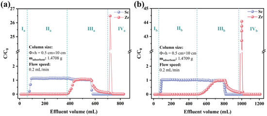 To simulate conditions for separating impurity of zirconium from scandium solution, a feed solution with a scandium–zirconium molar ratio of 10 was employed in the column experiments (Figure 12). The absence of ions in the effluent (C/C0 = 0) at the onset of section IIa in a sulfuric acid medium (Figure 12a) (C/C0 = 0) is attributed to the adsorbent surface possessing abundant adsorption sites, leading to the complete adsorption of Sc(III) and Zr(IV) that passed through the column. Following the initial penetration of Sc(III) from the column, its concentration in the tailing liquid gradually rose, reaching equilibrium at C/C0 = 1.13 ± 0.01. The C/C0 > 1 scenario is due to the depletion of adsorption sites, leading to the replacement of initially adsorbed Sc(III) with Zr(IV), which is attributed to the high affinity for Zr(IV). During this stage, almost no Zr(IV) was detected in the outset solution, resulting in a scandium purification rate of 99.8%. Similarly, in a hydrochloric acid medium (Figure 12b), the purification rate of Sc reached an even higher 99.99% in stage IIb, so that the precise separation of scandium and zirconium could be realized in this stage. Stage IV encompasses the Zr elution process, wherein all Zr bound to the adsorbent is eluted using 0.2 M H2C2O4. Notably, this process does not involve Sc, allowing for effective recovery of Zr.