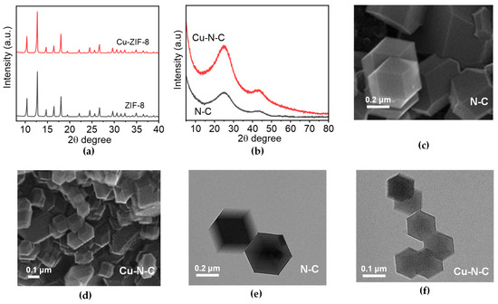 (a) XRD patterns of ZIF-8 and Cu-ZIF-8. (b) XRD patterns of N-C and Cu-N-C. SEM images of (c) N-C and (d) Cu-N-C. TEM images of (e) N-C and (f) Cu-N-C.