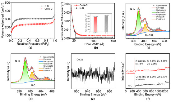 To further investigate the chemical states and elemental composition of the samples, XPS measurements were performed. The N 1s XPS spectra (Figure 2c,d) for N-C and Cu-N-C could be deconvoluted into four peaks centered at 398.2, 399.8, 400.7, and 405.9 eV, corresponding to pyridine N, pyrrole N, graphitic N, and oxidized N, respectively [7,23]. The results reveal that nitrogen in Cu-N-C predominantly exists in the form of pyridinic nitrogen, constituting 50% of the total nitrogen content, accompanied by a simultaneous decrease in graphitic nitrogen. The Cu 2p XPS spectra (Figure 2e) indicate that the copper content in Cu-N-C is extremely low, making it challenging to detect, with minimal discernible signal and predominantly background intensity. However, the XPS elemental analysis results confirm the successful incorporation of Cu, but the content was extremely low, reaching only 0.24% (Figure 2f).