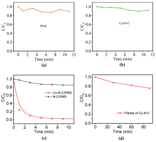 Elimination of BPA with the presence of (a) PMS and (b) Cu-N-C at different time intervals. (c) Elimination performance of BPA in different systems. (d) PMS activation performance of the filtrate of Cu-N-C. Routine condition: [catalyst] = 100 mg/L, [BPA] = 30 mg/L, [PMS] = 300 mg/L, temperature = 25 °C, and initial pH = 7.0.