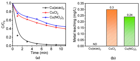 (a) PMS activation performance of catalysts prepared from different copper precursors. (b) Metal leaching of Cu-N-C catalysts prepared by different precursors. Routine condition: [catalyst] = 100 mg/L, [BPA] = 30 mg/L, [PMS] = 300 mg/L, temperature = 25 °C, and initial pH = 7.0.