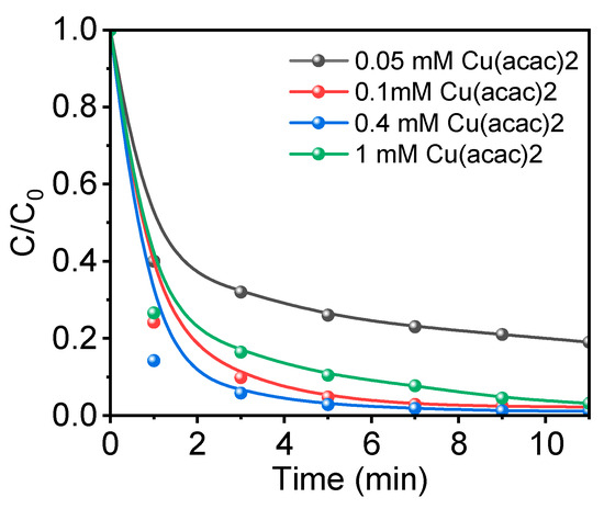 BPA degradation performance of Cu-N-C synthesized by Cu(acac)2 in different concentrations. Routine condition: [catalyst] = 100 mg/L, [BPA] = 30 mg/L, [PMS] = 300 mg/L, temperature = 25 °C, and initial pH = 7.0.
