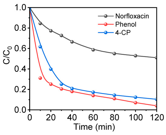 Simultaneously, norfloxacin was employed as a target contaminant to investigate the elimination efficiency of the Cu-N-C/PMS system toward complex and polyaromatic compounds containing fluorine halogens. As illustrated in Figure 8, the degradation rate of norfloxacin is notably slower in comparison to phenol and 4-CP. Specifically, the Cu-N-C/PMS system exhibits a degradation exceeding 40% of norfloxacin within 120 min, suggesting its efficacy in eliminating halogenated complex organic compounds.
