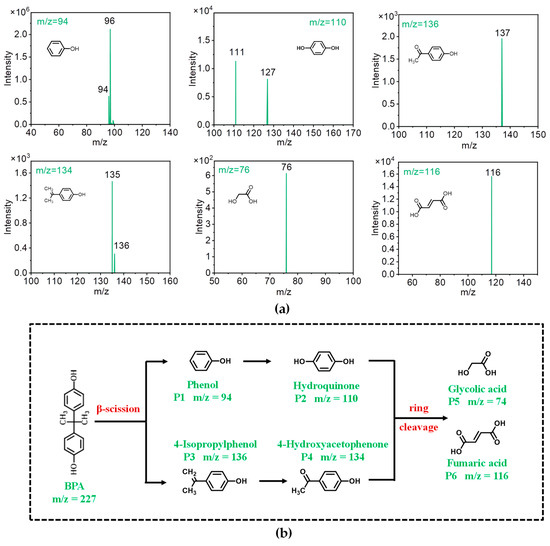 (a) Mass spectra of the detected BPA intermediates in the Cu-N-C/PMS system. (b) Presentation of the proposed degradation pathway of BPA in the PTEB-F15/PMS/vis system.