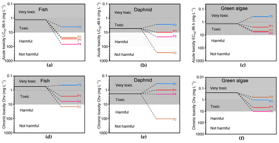 Acute toxicity LC50 of fish (a) and daphnid (b). Acute toxicity EC50 of green algae (c). Chronic toxicity Chv of fish (d), daphnid, (e) and green algae (f).