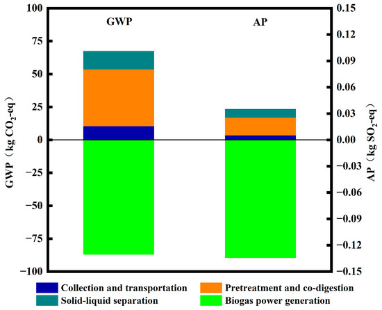 According to the collected data, each environmental impact category was converted to the equivalent of the same characteristic pollutant using the equivalence method to calculate the environmental impact at each stage of the life cycle. With reference to the studies by several scholars, this study selected four types of environmental impacts that significantly influenced the results [22,23]. The effects of global warming and acidification are shown in Figure 3. In summary, the anaerobic co-digestion of kitchen waste and residual sludge significantly contributed to mitigating GWP. Processes such as garbage collection and transport, pretreatment, co-digestion, and solid–liquid separation had a positive impact on GWP. However, the recovery and utilization of biogas resulted in a negative GWP value for biogas power generation. Overall, the combination of these processes resulted in a GWP of −19.76 kgCO2-eq. Similar results were obtained in the environmental impact assessment of anaerobic digestion of kitchen waste, with a GWP of −0.855 kgCO2-eq [24]. This strongly suggests that anaerobic co-digestion could contribute to mitigating global warming potential. Moreover, the anaerobic co-digestion treatment of kitchen waste and residual sludge had a minimal effect on AP, with an overall AP of −0.10 kgSO2-eq. This indicates that the anaerobic co-digestion system efficiently uses kitchen waste and residual sludge to recover energy, thereby mitigating environmental loads. Additionally, this technology can reduce the environmental impact associated with climate change and fossil energy consumption, thereby promoting the achievement of carbon dioxide “zero emissions” and contributing to carbon neutrality. China, as the world’s largest greenhouse gas emitter, has made addressing global warming a top priority. The United Nations Framework Convention on Climate Change urges countries to implement measures for reducing emissions [17]. The extensive use of fossil fuels has significantly influenced the environment, resulting in the release of key pollutants, such as sulfur dioxide, suspended particles, nitrogen oxides, and carbon dioxide, that have led to severe environmental pollution [25]. Therefore, a fundamental shift is required in the methods involved in the production, transportation, and consumption of energy [26]. Furthermore, pathways for waste recycling must be established to effectively reduce greenhouse gas emissions.