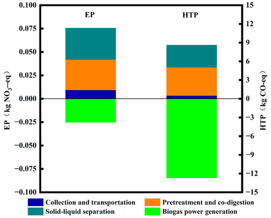 The effects of EP and HTP on the anaerobic co-digestion system of kitchen waste and residual sludge are shown in Figure 4. The life cycle EP of the anaerobic co-digestion system was −0.05 kg NO3-eq, and HTP was −4.11 kg CO-eq. Similar results for EP were reported in related studies. Oldfield et al. reported an EP of −0.003 kgNO3-eq, Slorach et al. estimated EP to be 1.24 kgNO3-eq, and Fei et al. suggested EP to be 0.19 kgNO3-eq [14,27]. However, a direct comparison of these results with those reported by relevant scholars [28] was challenging owing to differences in system boundaries, assumptions, and methods used for life cycle impact assessments. Overall, anaerobic digestion treatment technology had the lowest impact on global warming compared with composting, incineration, and landfilling. Composting significantly contributed to eutrophication while landfilling had the highest environmental impacts, including AP, GWP, EP, and HTP [29,30]. Even on a relatively small scale, anaerobic digestion treatment technology has contributed to energy conservation and emission reduction with certain environmental significance [31]. However, the impact of anaerobic digestion treatment technology on the environment is limited by various factors, such as the biogas production potential of the substrate, process scale, and technical route. Further improvements in the treatment technology can enhance its positive impact on the environment in the future.