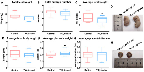 - Hong, F.; Zhou, Y.; Zhao, X.; Sheng, L.; Wang, L. Maternal exposure to nanosized titanium dioxide suppresses embryonic development in mice. Int. J. Nanomed. 2017, 12, 6197–6204. [Google Scholar] [CrossRef] [PubMed]