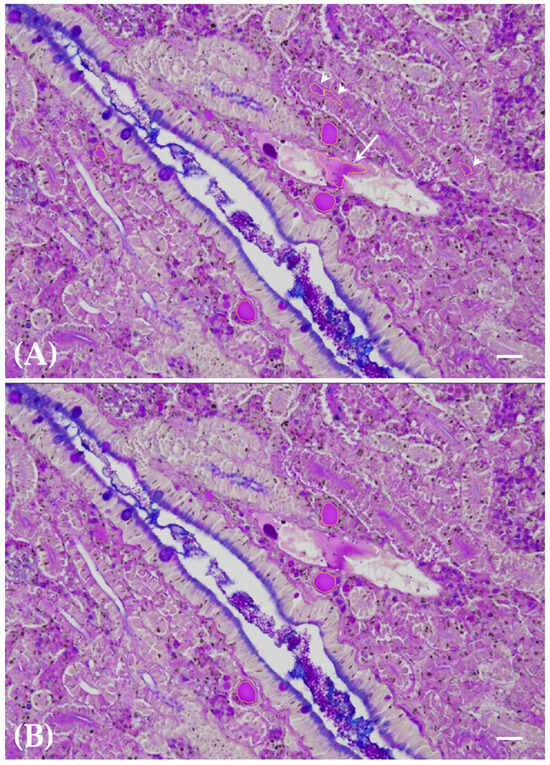 Paraffin-embedded tissue sections of carp kidneys from fish exposed to 200 ng L−1 PFOA. Alcian blue–PAS. Scale bar = 25 μm. Segmentation results before (A) and after (B) fine-tuning of segmentation parameters are depicted. Examples of falsely positively segmented structures, such as plasma in a vessel (arrow) and renal tubule brush border (arrowheads), due to their PAS positivity, are shown in panel (A). These structures were no longer visible after fine-tuning, leaving only correctly classified thyroid follicle colloids outlined by yellow lines in panel (B).
