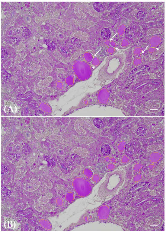 Segmentation yielded a dependable identification of all thyroid follicle colloids within the renal tissue (Figure 1A–C), with no falsely segmented follicle colloids remaining after meticulous fine-tuning of the method. Conversely, a negligible 3% of follicle colloids persisted in being falsely classified as negative among the total number of segmented follicle colloids. These falsely unsegmented follicle colloids were primarily small entities, predominantly associated with the 200 ng L−1 PFOA exposure group. The outcomes of meticulous fine-tuning are illustrated in terms of false positive and false negative correction, as depicted in Figure 2A,B and Figure 3A,B, respectively.