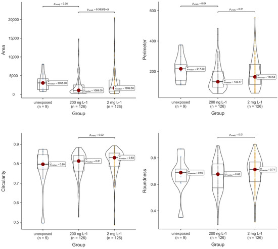 Violin and box plot of thyroid follicle colloids’ cross-sectional area (pixel2), perimeter (pixel), circularity, and roundness (dimensionless) according to experimental exposure group (n = number of screened thyroid follicle colloids). Each coloured bullet denotes a single data value for each morphometric parameter/experimental group. Significant differences, where present, are indicated by horizontal whiskers along with the respective p-values.