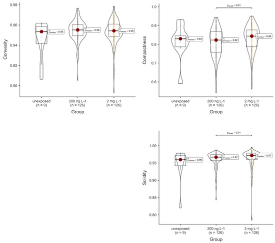 Violin and box plot of thyroid follicle colloids’ convexity, compactness, and solidity (dimensionless) according to the experimental exposure group (n = number of screened thyroid follicle colloids). Each coloured bullet denotes a single data value for each morphometric parameter/experimental group. Significant differences, where present, are indicated by horizontal whiskers along with the respective p-values.