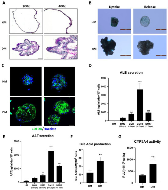 ALB secretion from liver organoids cultured in HM was almost negligible. However, when differentiated organoids were assayed for ALB secretion, the amount of secreted ALB significantly increased during the differentiation period. Liver organoids induced for differentiation for 6, 8, and 10 d demonstrated 355.89, 814.16, and 3669.33 ng/mL/day/106 cells of ALB secretion, respectively. However, the albumin secretion did not increase indefinitely when differentiation persisted beyond a certain level over the long term. In organoids differentiated for 17 days, 960.93 ng/mL/day/106 cells of albumin were secreted (Figure 3D). When the secretion of AAT was measured in the culture medium on differentiation days, 6, 8, 10, and 17, the results showed a pattern similar to that of albumin. Though the secretion increased as the differentiation period was extended, it exhibited a decrease in secretion after a certain period (Figure 3E). Furthermore, the expression of drug metabolism-related genes showed an increasing trend with differentiation, reaching a peak around day 6~8, followed by a decrease in expression thereafter (Figure S1). Samples obtained after cell lysis were used to quantify bile acid production using a colorimetric assay. Differentiated cells secreted significantly more bile acid than cells cultured in HM (Figure 3F). After treatment with CYP3A4-enzyme-inducing Nifedipine, the measured CYP activity in DM-cultured organoids was approximately 2.4 times higher compared to HM-cultured organoids (Figure 3G).