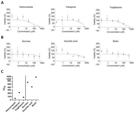 Cell viability of DILI substances and non-hepatotoxic substances. Cell viability was measured using cell-counting kit assays; (A) DILI substances (ketoconazole, tolcapone, and troglitazone) and (B) non-hepatotoxic substances (sucrose, ascorbic acid, and biotin). All substances were treated at concentrations of 500, 100, 20, 4, 0.8, and 0.16 μM. Data are expressed as mean ± standard deviation (n = 3). (C) TC50 values of the six substances. DILI, drug-induced liver injury.