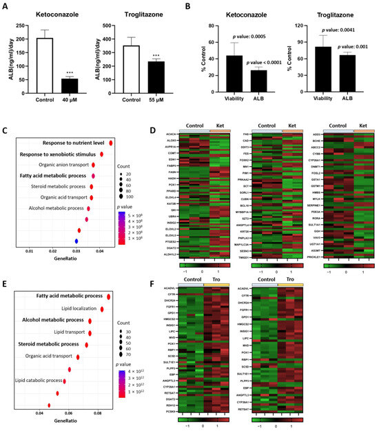 Albumin secretion and GO analysis in hepatotoxic drug-treated liver organoids. Albumin secretion (A) and relative viability or albumin concentration (B) of the cell treated with ketoconazole 40 μM and troglitazone 55 μM compared to 1% DMSO control group. The data are presented as the mean ± standard error of the mean (n = 6) and were analyzed by Student’s t-test, *** p < 0.001 compared to control. The presented p value means the results of a Student’s t-test analysis comparing the highest concentration group to the control. The GO terms using the BP algorithm dot plot (C) and the heatmap (D) of the response to the nutrient level (left), the response to xenobiotic stimulus (center), and fatty acid metabolic process (right)-related DEGs in ketoconazole-treated organoids. The GO terms dot plot using the BP algorithm (E) and the heatmap (F) of alcohol metabolic process- (left) and steroid metabolic process (right)-related DEGs in troglitazone-treated organoids. GO: gene ontology. BP: biological process. DILI: drug-induced liver injury. DEGs: differentially expressed genes.