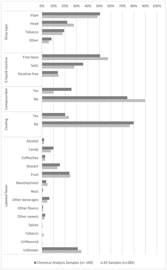 Due to financial constraints, we needed to limit the number of samples for chemical analysis. Of the 285 total e-liquids purchased, 75 e-liquids were randomly sampled. Additionally, some of the 285 samples that were compounded in-shop (n = 34) or uniquely packaged (n = 14) that were not already in the random sample were also included (n = 24 and n = 10, respectively). Uniquely packaged samples were defined as those not in containers resembling small bottles, with outer packaging resembling everyday items, or were not standard rectangular packages, resulting in 109 samples being analyzed.