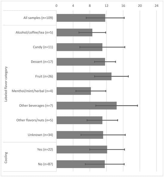 The mean number of ingredients with standard deviation error bars by e-liquid categories.