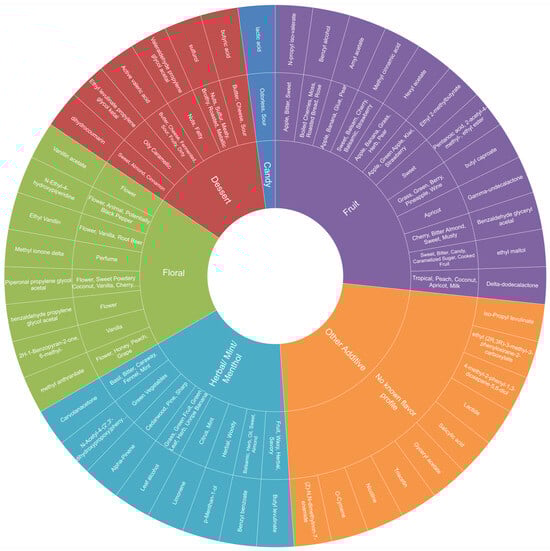 To illustrate the results, we developed a Flavor Ingredient Wheel (Figure 4), as described in Section 2.2. Our Flavor Ingredient Wheel has three levels. The outer level identified chemicals by common name, or by chemical name if there was no identified common name (see Section 2.2.1). The middle level contains the flavor descriptor as assigned in Section 2.2.1 and Section 2.2.2. The inner level categorizes the flavor ingredients similar to Krüsemann’s flavor categories and includes six primary categories: fruit, candy, dessert, floral, herbal/mint/menthol, and other additives (see Section 2.2.3). The Flavor Ingredient Wheel excludes the following solvents: propylene glycol and glycerin. Table 1 and Table A3 provide the Flavor Ingredient Wheel detailed information.
