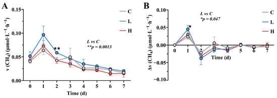 Temporal changes in methane emission rate (A) and rate increment (B). The rate increment is calculated by subtracting the previous day’s rate from the current day’s rate. C represents the control group, L represents the low-concentration group, and H represents the high-concentration group. The significance markers in Figure 1A and 1B represent the results of the Student’s t-test comparing the C and L groups on day 2 and day 1, respectively.