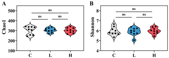 Chao1 (A) and Shannon (B) indices of bacterial and archaeal communities in each group after E2 contamination. C represents the total of samples from the control group collected on days 2, 4, and 6; L represents the total of samples from the low-concentration group collected on days 2, 4, and 6; H represents the total of samples from the high-concentration group collected on days 2, 4, and 6. “ns” indicates no significant difference.
