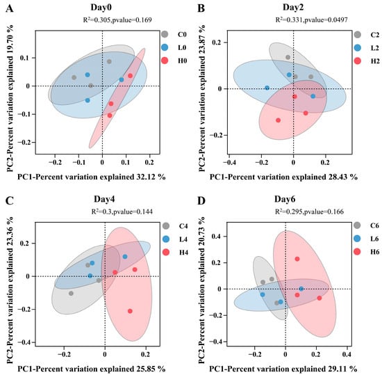 The Principal Coordinate Analysis (PCoA) of bacterial and archaeal communities on days 0 (A), 2 (B), 4 (C), and 6 (D). Sample labeling rule: Letters represent groups, and numbers represent dates. For example, C0 represents samples from the control group on day 0.