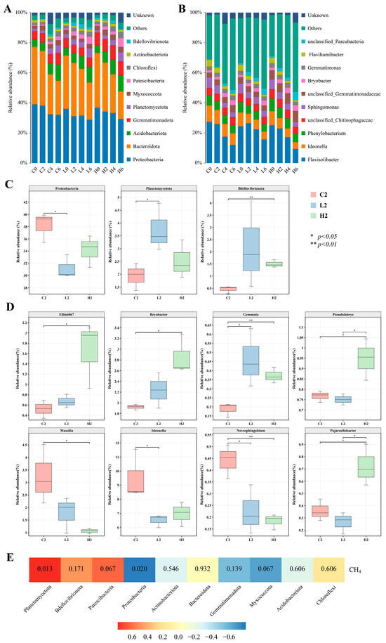 Taxonomic composition of bacterial and archaeal communities at the phylum (A) and genus (B) levels, and relative abundance of differential phyla (C) and genera (D) on day 2. C2, L2, and H2 represent samples from the control group, low-concentration group, and high-concentration group, respectively, on day 2. (E) Heatmap of the correlation between major phyla and CH4 emission rates on day 2.
