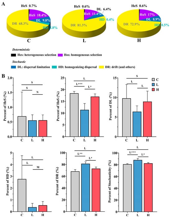 Relative importance of various ecological processes within each group (A) and differences in ecological processes among groups (B) after E2 pollution. C represents the total of samples from the control group collected on days 2, 4, and 6; L represents the total of samples from the low-concentration group collected on days 2, 4, and 6; H represents the total of samples from the high-concentration group collected on days 2, 4, and 6. *** p < 0.001; ** p < 0.01; * p < 0.05. L, M, S, and N represent large (|d| > 0.8), medium (0.5 < |d| ≤ 0.8), small (0.2 < |d| ≤ 0.5), and negligible (|d| ≤ 0.2) effect sizes of E2 pollution based on Cohen’s d.