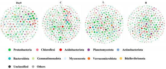 Molecular ecological networks (MENs) before and after E2 pollution. Node size represents the node degree. Edge color represents positive (red) and negative (green) correlations. Day 0 represents the total of samples from three groups collected on day 0; C represents the total of samples from the control group collected on days 2, 4, and 6; L represents the total of samples from the low-concentration group collected on days 2, 4, and 6; H represents the total of samples from the high-concentration group collected on days 2, 4, and 6.