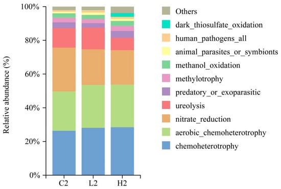 Functional predictions were conducted using Faprotax for bacterial and archaeal communities on day 2. Out of 562 ASVs, 83 were assigned to at least one functional group. The most abundant functional groups in all three treatment groups were chemoheterotrophy (26.3–28.5%), followed by aerobic_chemoheterotrophy (23.4–25.5%) and nitrate_reduction (20.4–25.9%) (Figure 7). Significant variations in the relative abundances of major functional groups were observed among the three treatment groups. Both pollution groups exhibited higher levels of aerobic_chemoheterotrophy and chemoheterotrophy compared to the control group, while nitrate_reduction was lower in the pollution groups (Figure S2). Moreover, functional groups associated with methane production, such as methanogenesis, methanogenesis_by_CO2_reduction_with_H2, and hydrogenotrophic_methanogenesis, were most abundant in the high-concentration group, followed by the low-concentration group. The methane oxidation functional group, methanotrophy, was enriched in the control group (Figure S2). Hence, E2 has the potential to influence microbial carbon and nitrogen cycling within the system.