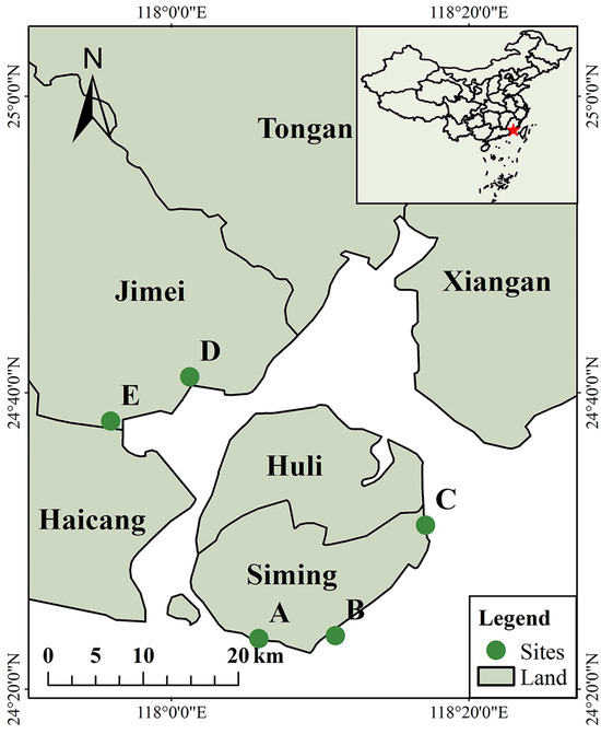 Our study was conducted in Xiamen City, Fujian Province, China, within the longitude and latitude ranges from 117°52’56’’ E to 118°22’26’’ E and from 24°23’13’’ N to 24°54’26’’ N, respectively (Figure 1). It consists of six administrative divisions: Huli District, Siming District, Jimei District, Xiang’an District, Tong’an District, and Haicang District. The tidal patterns exhibit regular semidiurnal fluctuations and an average tidal range of 4.08 m [40]. The area experiences a subtropical maritime monsoon climate, characterized by an average annual temperature and rainfall of 21 ℃ and 1200 mm, respectively [41,42]. The rainy season in Xiamen extends from March to September and is mainly influenced by the southeast and southwest monsoons. During this period, precipitation is frequent, often accompanied by brief showers or continuous drizzle. Land scouring is highly likely under this rainfall pattern.