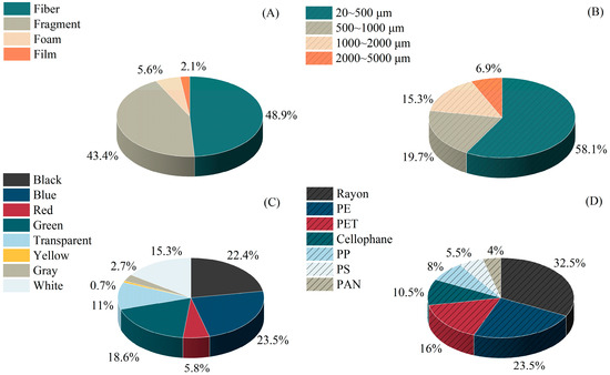 Shape (A), size (B), color (C), and polymer type (D) composition (%) of the microplastics on the beaches in Xiamen City.