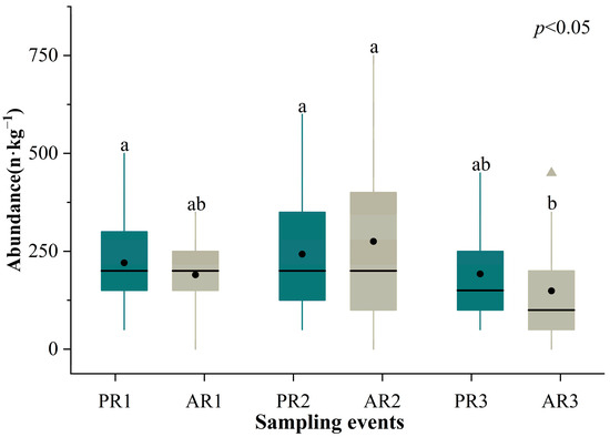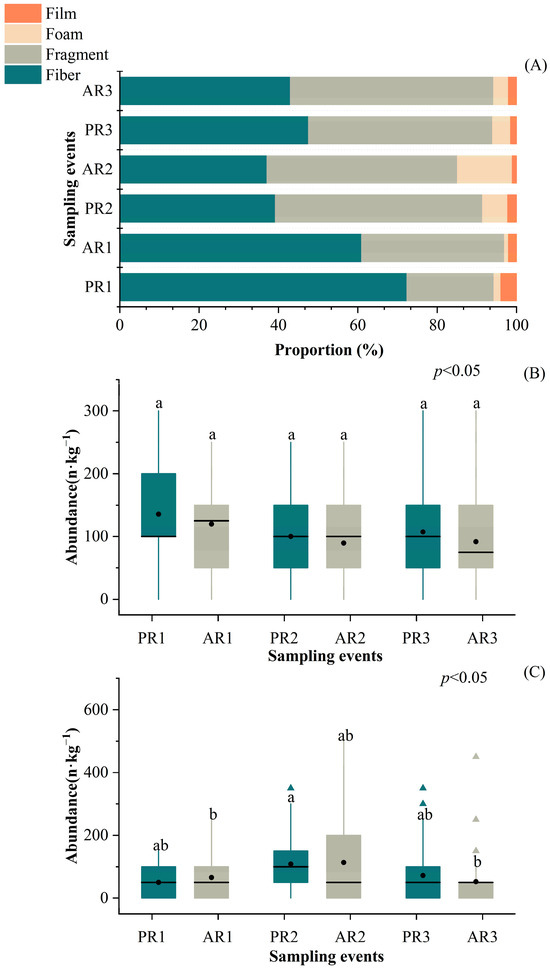 There were significant temporal variations in the abundance of microplastics among the different sampling events (p < 0.05). The abundance decreased significantly in AR3 compared with PR1 (p < 0.05), with the lowest value being 100.0 n·kg−1. However, the abundance of microplastics before and after all three rainfall events did not differ significantly (Figure 3).