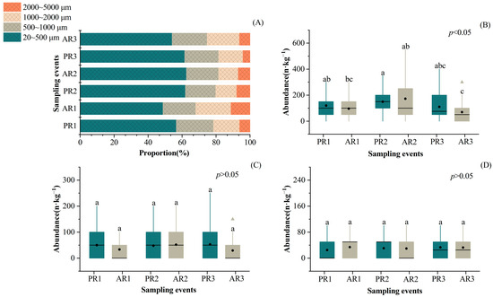 The proportion of microplastics of different sizes varied slightly among the sampling events. Overall, higher percentages of smaller microplastics were observed (Figure 4A). Additionally, microplastics of varying sizes displayed distinct variation patterns during sampling events. The abundance of the 20–500 μm size category differed significantly among the three rainfall events (p < 0.05); in particular, contamination was significantly lower in AR3 compared with PR1 (p < 0.05) (Figure 4B). However, no significant differences in the abundance of these microplastics were observed before or after each rainfall event. Nevertheless, the abundance of plastics with sizes of 500–1000 μm and 1000–2000 μm was not significantly affected by the three rainfall events (p > 0.05) (Figure 4C,D).