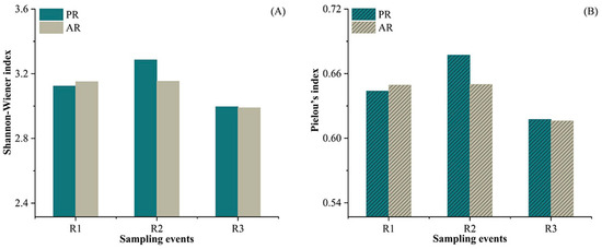 Both the Shannon–Wiener index and Pielou’s index were used to estimate the diversity of microplastics in terms of size, color, and shape among the different sampling events (Figure 6). In total, the Shannon–Wiener index decreased in AR3 compared with PR1, with the lowest value at 2.99 (Figure 6A). Similarly, Pielou’s index decreased in AR3 compared with PR1, from 0.64 to 0.62 (Figure 6B). However, there were no significant trends in the variations in the indexes before and after three individual rainfall events (Figure 6A,B).