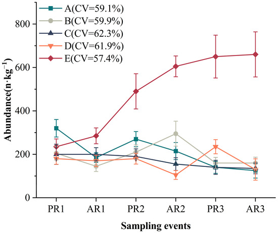 The response of microplastic concentration also varied among sites, with the highest and lowest quantities of 660 ± 103.76 and 105 ± 20.34 n·kg−1 detected at site E in AR3 and site D in AR2, respectively. A decreasing trend was observed in the abundance of microplastics at most sites in AR3 compared with PR1, although there were fluctuations in these processes. Moreover, the concentration of microplastics varied the most among the sampling events at site C. In contrast, the abundance of microplastics at site E showed relatively slight variation among the sampling events (Figure 7).